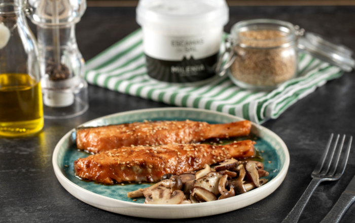 SALMÓN TERIYAKI CON ESFERIFICACIONES DE SAL CÍTRICA MILENIA